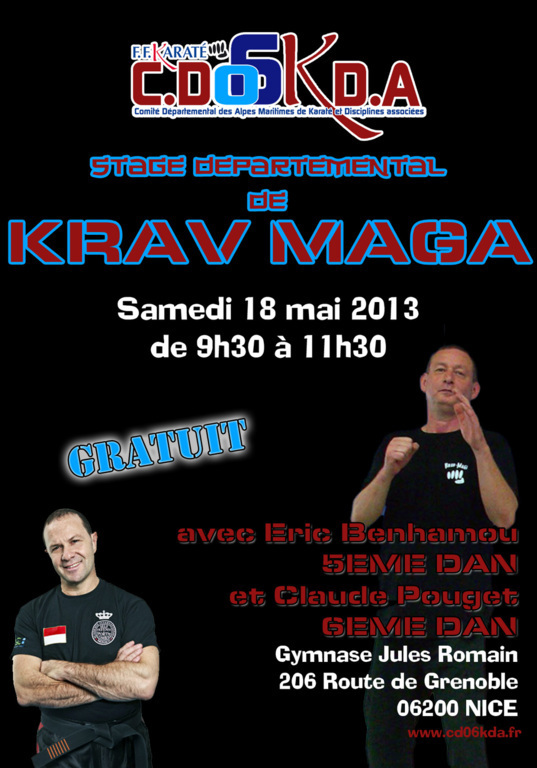 Le comité départemental de Karaté et disciplines associées organise Le SAMEDI 18 MAI 2013, à partir de 9h30 Un stage GRATUIT de Krav Maga, avec Eric BENHAMOU 5e danet Claude POUGET 6e dan