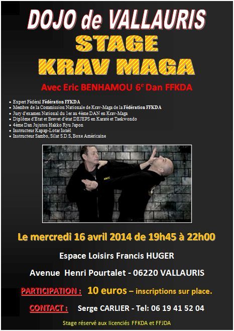 Le mercredi 16 avril 2014 le Dojo de Vallauris propose à tous les licenciés FFKDA et FFJDA un stage de KRAV MAGA dirigé par M. Eric BENHAMOU :