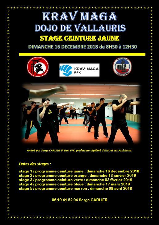 Stage obligatoire pour ceux qui veulent obtenir le grade supérieur (programme FFK niveau ceinture jaune Krav Maga) DIMANCHE 16 DÉCEMBRE de 8h30 à 12h30...Prévoir bouteille d'eau et un encas pour la pause de 10h00...